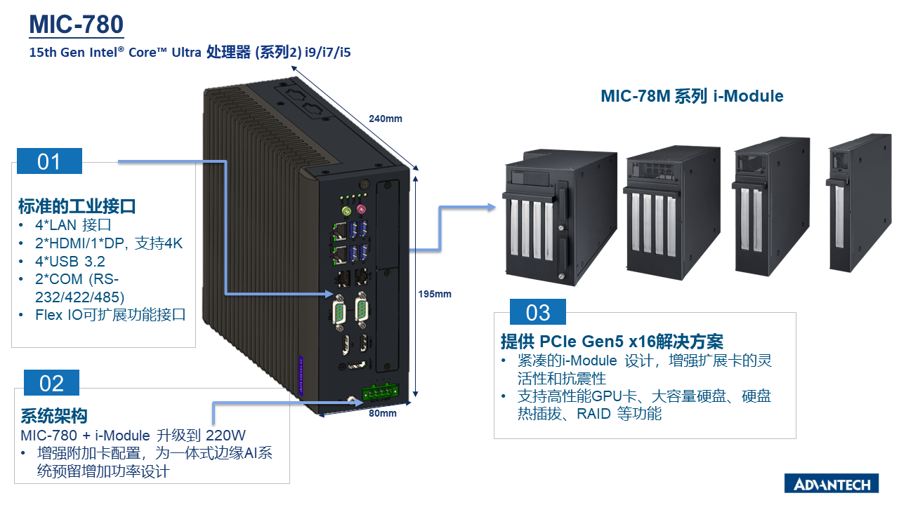 MIC‑780紧凑型无风扇模组化计算系统,搭载英特尔®酷睿™Ultra 5/7/9处理器(系列2)。MIC‑780 可与全新 MIC‑78 系列模块无缝集成,可降低部署复杂度与成本,实现更快速的现场升级。