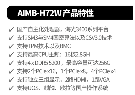 基于海光3400系列平台的多维安全技术保障体系,可支持SM3/SM4国密指令和CSV3.0。AIMB-H72W设计支持TCM模块可以在硬件上进一步加强安全防护;另外该主板通过配置BMC模块,可以实现远程管理、硬件监控和管理、SOL重定向等功能,帮助管理员实时监测服务器状态,确保数据中心的稳定运行。